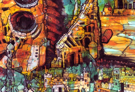 A showcase of paintings by Nicole Handel and Jack Jerz, who both specialize in vibrantly colorful scenes of urban post-apocalyptic rubble.