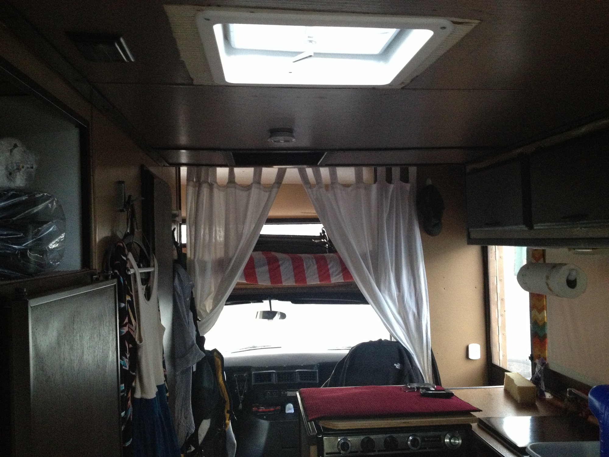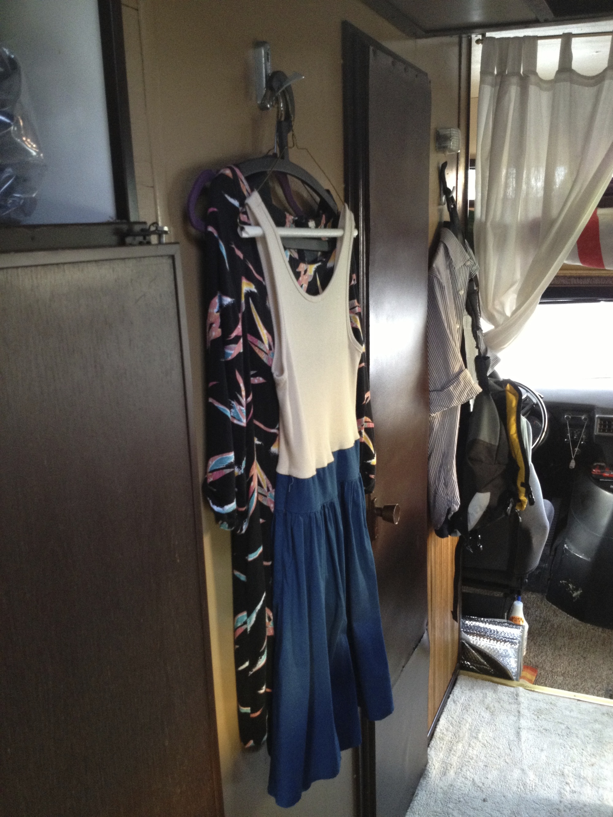 On a typical week Moriarty stays in his RV four or five nights. And here’s the kicker. Many of those nights he is joined by his girlfriend. His Shasta doesn’t house much, but one of the first things you notice are his girlfriend’s dresses hanging on the closet door. She’s a lawyer too, and clearly a trooper. “It’s been very impressive!” he said. “She’ll get ready here in the morning, or a couple of times she’s had to get ready at a Whole Foods, which I felt bad about — so she’s very, very supportive.”