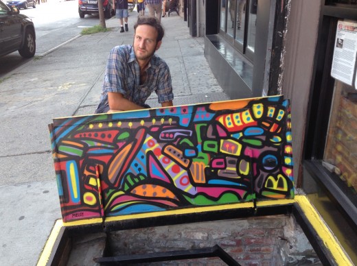 Meloy is also the art curator for the LES music venue Arlene’s Grocery. To date, he’s curated shows featuring about 95 local artists. “It’s great,” he said. “It gives people a chance to show their work in a fun, down-to-earth environment.” He’s also turned the basement of Arlene’s into his own giant canvas with murals covering every available inch. It’s a bit of a time capsule, with some of the drawings done in his older, intricate style, while other walls are spray painted with the larger abstract shapes that have come to characterize his more recent work. One thing they all have in common is their high-energy, fun, childlike quality. “I have no interest in doing the same work anyone else does, or being the next Pollock,” he said. “I want to be the first Joseph Meloy.”