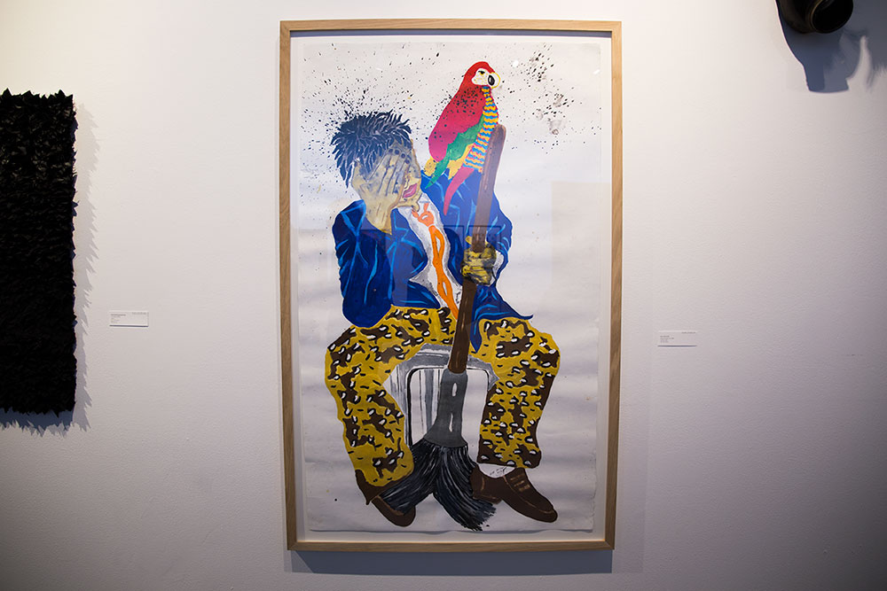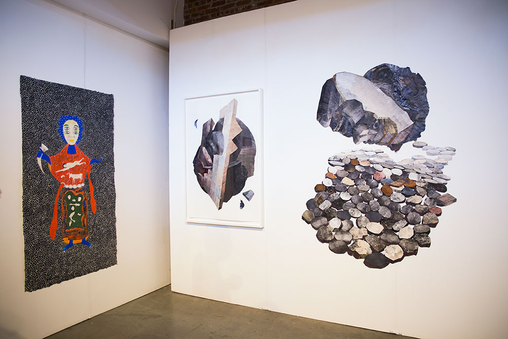 11. At left are the collages of Yashua Klos. Get ready to have your mind blown– those cut-out bits aren’t photographs of stones or even paintings or anything like that. In fact, they’re woodblock prints. And if you look closely, they almost have the appearance of petrified wood. At right, painting by Angolan-born French artist Franck Lundangi.