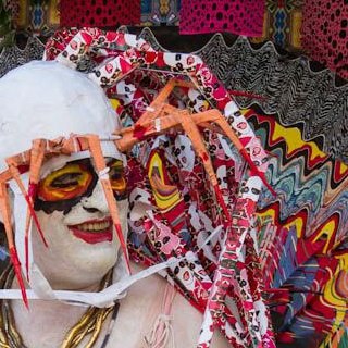 Ridgewood bar and venue The Footlight, which features local bands as well as fitness and yoga classes, will now be turning their main room into a gallery space of sorts beginning this Tuesday. Throughout the winter season, the space will showcase the work of colorful NYC-based artist Rolando Vega. The East Village-based street artist is also known as “The Chickinman,” and can usually be found sporting complex and slightly terrifying costume creations, incorporating items like leis, Barbie dolls, spikes, face paint, and rainbows. Recently photographed by The New York Times for his elaborate Easter costume with plastic eggs and “sea creature legs,” Vega’s creative output also extends beyond his own body. The work on view at The Footlight appears to be mostly 2D patchwork creations, containing the same vibrantly colorful, jagged elements as his costumes. Vega and his son Henry will be present at the opening tomorrow night for a meet-and-greet, and any work purchased at the opening will come with a complimentary glass of champagne.