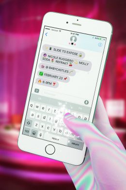 This “collaborative augmented reality installation” is created by Molly Soda, Nicole Ruggiero, and an augmented reality app called Refrakt. If you’re confused about what augmented reality is, recall Pokemon Go. Two creators known for their “net art” collaborating with a literal app sounds like a match made in heaven. And it seems to be: Slide To Expose plays on themes of digital intimacy and privacy, but does so by asking viewers to scan objects in the gallery to reveal hidden pieces of a life online, like emails or text messages.