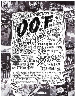 This unique art show in a notorious tattoo parlor goes by the acronym “OOF,” which could very well be one of the sounds you once made while getting a tattoo. Or while checking out some very cool tattoo art and paintings based on “legendary” NYC bands, which is what this art show is all about. While some art shows serve wine, when you go to an art show in a tattoo shop co-produced by one of the remaining Greenwich Village record stores (Generation Records, to be clear) you should assume you’re getting something a bit different. In OOF’s case, this means free PBR… and also free meatballs. Literally, they are from The Meatball Shop and everything. Prepare thee to fill your eyes with art, your mouth with balls (sorry), and your ears with tune spun by DJ Uncle Remy all night long.
