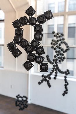 While the works on view are mostly sculptural, each artist takes a unique approach to composition and materials. Rather than exploring the tech vs. nature theme in ways that might be heavy-handed or passé, the ideas predominantly come forth in how each piece is created. Kathryn Cameron builds her sculptures using items reminiscent of tree bark or leaves, Nadia Martinez makes pieces out of computer parts, and Taka Maruno creates soft and colorful print installations that simultaneously recall imagery like bacteria, street art, and flowers.