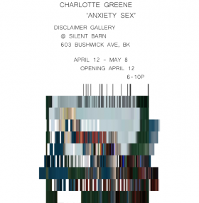 Ah, anxiety and sex, two things that go together like peanut butter and jelly, or perhaps crying and bathrooms. Artist Charlotte Greene, the latest to set up shop at the inclusive Disclaimer Gallery inside the Silent Barn, sees this all too well. Focusing on the many strange ways digital encounters can translate to IRL ones, Greene has formed an array of digital collages made from predictive iPhone text, tweets, stream-of-consciousness writing, and more.