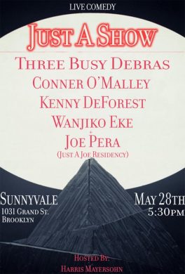Just A Show is a comedy show hosted by Harris Mayersohn, and this is the latest edition of the show’s “Just A Joe” residency, featuring the one and only Joe Pera. If you haven’t yet seen Joe do his thing, it is highly recommended. The rest of the lineup isn’t too shabby, either, with the darkly compelling group Three Busy Debras, Conner O’Malley, Wanjiko Eke, and Kenny DeForest.