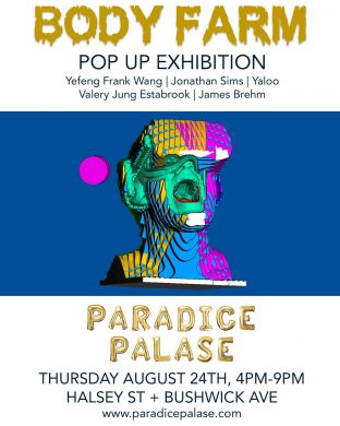 Ok, to ease your nerves (or disappoint you), this isn’t an exhibition of an actual body farm. If you’re unfamiliar with the term, body farms are decomposition research facilities. So then, what is this Body Farm? It’s a one-night-only pop-up exhibition being put on by Paradice Palase, a Brooklyn space that “believes in a community-supported gallery model and getting artists paid for their efforts.” TBH, really all you have to say is that this is an organization that cares about paying artists and that would make their show worth going to. Plus, there seems to be a neon pineapple sign involved, which sounds fun.