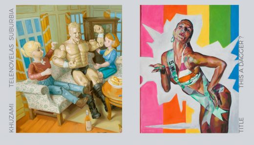 Khuzami takes inspiration from kitschy knickknacks and filmmakers like Todd Solondz and Wes Anderson. Her process is multifaceted; first she creates a miniature strange suburban scene using real objects and sets it up inside an actual vintage dollhouse. She lights these scenes and photographs them, then plays with the images digitally. After all this, she creates a painting based on the final result. Daena Title’s work focuses less on the actual suburbs and what they look like, but rather what activities its residents may partake in. She paints beauty pageant contestants, delving into the insidious nature of that faux-empowerment culture.