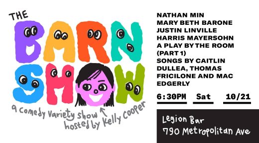 Even if this ain’t your first rodeo, this could be your first Barn Show. Hosted by Kelly Cooper, this comedy variety show does not take place in a barn, but it does take place in the back room of a bar. “Bar” is just one letter away from being “barn,” so maybe if you bring a big cardboard cutout of the letter “N” the place will magically transform into a farmland paradise. We can only dream. In the event that this does not happen, there will still be plenty of nice comedy to see from Nathan Min, Mary Beth Barone, Justin Linville, and Harris Mayersohn, plus a portion of a play by a group called The Room, and a selection of songs from The Barn Band, which is a trio consisting of Thomas Fricilone, Caitlin Dullea, and Mac Edgerly, but I secretly wish was a merry band of animatronic creatures.