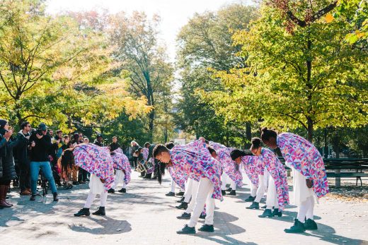 Even if you’d never been to one before November 2016, you’re more than likely now familiar with politically charged marches. Aside from being surprisingly exhausting to take part in, especially if you’re not wearing your most comfortable shoes (I found this one out for myself folks), marches have been a method of getting your voice heard, whether it’s to celebrate or protest. In Bryony Roberts and Mabel O. Wilson’s new research-based exhibition Marching On, a spotlight is shown on not only marches but the historic presence of African-American marching bands and drumlines in these public displays. In addition to featuring performances from the Marching Cobras, a youth music, drum, and dance group based in Harlem, the exhibition uses photography, fabric, text, and more to explore how black marching bands have served through the years as platforms for cultural expression, protest, and visibility in times of segregation and discrimination.