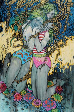 For an exhibition sporting as foreboding a title as The End of Love, Rebecca Leveille’s paintings are so entrancing as to inspire a sort of optimism in the viewer. In addition to being strikingly beautiful, her paintings portray feminine beauty, bliss, and sexuality in a way that’s playful and mixes elements of realism and mythology, allowing for a mental break from the seemingly constant barrage of nonsense coming from the world. Leveille is no stranger to the realm of the fantastical, as she has previously created illustrations for Magic: The Gathering under the name Rebecca Guay. Looking to how the artist herself has spoken of this show, the connection between the title and the content begins to feel more clear. “What comes after delusions of ‘love?,’” she writes. “Feminine power and sexuality find new ground, as does an urgency to assert the female gaze.”