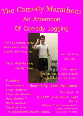 You guys have heard of 4:20, but what about 6:20? Ok, I’m burying the lede here, the reason I’m listing this show isn’t because of the start time, it’s because it literally takes place while jogging. Ok, ok, I hate all types of fitness too, but I’ve been told this show only takes place during a “light jog,” so I’m going to have faith that it won’t be too exhausting. Ideally, it will give you the satisfaction of getting exercise and seeing some good comedy at the same time. Think of it as like when you watch a show on your phone at the gym or something, if that’s a thing people do, except this time you’ll actually be supporting real live comedy. So, join host Jason Weitzman and a gaggle of amped-up stand-ups and improv teams for a comedic adventure through Bushwick. Apparently you can register online and get one of those pieces of paper you put on your chest during a real marathon, so really, what are you waiting for?
