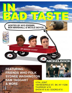 Comedy that’s done in bad taste sounds, well, bad, but I would venture to say that’s not always true. Yes, there’s comedy associated with the likes of cis white dudes who yell at you for being the PC police if you criticize their inconsiderate jokes, but then there’s comedy that could be lovingly referred to as dumb, absurd, or trashy. I can only assume this show hosted by Ayo Edebiri, Nicole Boyce, and Ben Marshall falls into the second category. While there won’t be any improv (“we have limits,” they say), there will be ruminations on anything that might be considered “the trash of the earth,” such as Smash Mouth and coconut Lacroix. So, come one, come all, and see Friends Who Folk, Sydney Washington, Sam Taggart, and others serve up some lowbrow lusciousness.