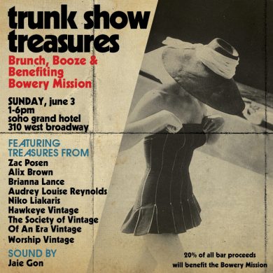 The weekend is typically associated with excess, whether that’s an excess of lounging n’ Netflixing or boozing n’ partying. Oh, and brunch, the notorious brunch. Let’s face it, you’re probably going to be spending money this weekend in one way or another, so why not do so in a way that will also benefit others? You can do just that this Sunday at the latest edition of the Soho Grand Hotel’s Trunk Show Treasures, a brunch party and vintage shopping experience that helps raise money for the Bowery Mission.