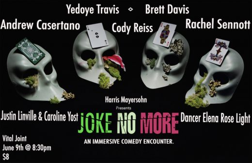 Maybe you’ve seen Sleep No More, the consistently buzzed-about immersive Shakespeare-inspired show (and now, essentially tourist attraction) that gives you a Phantom of the Opera-esque mask and takes you on a spooky journey of dance, intrigue, and intimate encounters (sometimes too intimate). or, maybe you couldn’t afford it—fancy immersive theater regretfully doesn’t run cheap. Whoever you are, you’re invited to experience the more comedic side of interactive performance at Harris Mayersohn’s Joke No More. Down in the basement of East Williamsburg’s Vital Joint, you’ll be given a mask (of course) and treated to special one-on-one performances from the likes of Brett Davis, Justin Linville, Yedoye Travis, Caroline Yost, Rachel Sennott, Andrew Casertano, Cody Reiss, and dancer Elena Rose Light.