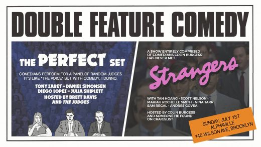 Have you ever gone to a comedy show and after it’s over you turn to the person next to you and say, Wow, I sure wish there was another one of these happening right now? Chances are, probably not, but that’s because there are a lot of shows out there that are either too long, not that good, or both. Fortunately, some shows are both the right length and filled with consistently quality content. Brett Davis’s latest comedic double feature at Bushwick’s Alphaville seeks to leave you wanting more after the first show, and even has a second show waiting there, just for you. The night will begin with Strangers, Colin Burgess’s show featuring exclusively comedians he’s never met, and will continue with The Perfect Set, a competition-style comedy show that’s like The Voice but with random people judging it instead of celebrities.