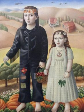 If you ever rode the Haunted Mansion ride at Disneyland, you’ll recall paintings hung on some of the walls that had eyes that appeared to follow you as you moved your own from side to side. Spooky! That’s sort of how I feel when I look at the wide-eyed paintings done by Amy Hill, who is opening a solo exhibition at Lower East Side’s Front Room Gallery on Wednesday. Her portraits are realistic while also being surreal and a little creepy (even the cats stare at you with unblinkingly large eyes), bringing the style of 19th century American folk art into more modern times. Rather than setting her figures in the 21st century, she curiously grounds them in 1960s counterculture, where peace-sign necklaces and fringed leather replace any peasant frocks. We never actually found that peace, did we…