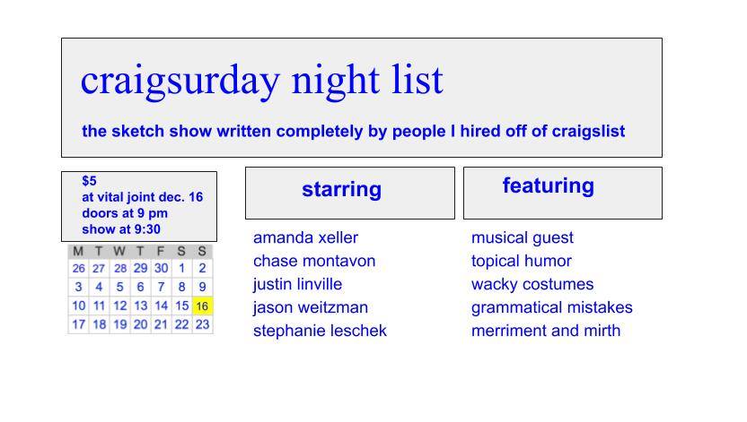 Once a more bustling place to find all sorts of things, Craigslist is mostly used today for buying and selling questionable furniture and looking for jobs or apartments once you’ve exhausted your other, less anonymous options. But as it turns out, it can also be used to recruit writers you’ve never met before to pen sketches for a comedy show, and that’s precisely what Larry Sass-Ainsworth is doing for the second edition of Craigsurday Night List. (Please note the show is on a Sunday.) While the writers are Craigslist randos, the cast is more familiar, consisting of Brooklyn comedy regulars Justin Linville, Amanda Xeller, Chase Montavon, Jason Weitzman, and Stephanie Lescheck.
