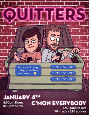 Already feeling reluctant to follow through with your New Year’s resolution? You’re not alone. Enter into a legacy of quitting at Sam Corbin and Ian Goldstein’s show where failure takes front and center in a way that’s meant to stir up camaraderie rather than frustration. After a lengthy run at Pete’s Candy Store, they’re setting up shop at Bed-Stuy’s C’mon Everybody, but despite continuing this show for so long, you can be sure they’ve quit something else along the way. Tonight features comedians Joe Rumrill, Fareeha Khan, Alex Song, and Taylor Ortega, and you’ll have a chance to get up there yourself and detail a moment you gave something up for the chance to win a free drink. So go ahead, cancel that candlelit yoga class you scheduled for tonight and come see some quitting.