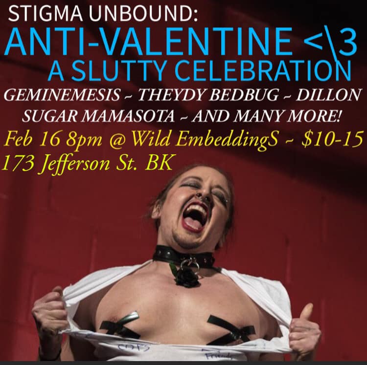 If you’re still feeling the V-Day burn several days after the fact (emotionally or literally, I don’t judge), you still have time to steep yourself in anti-Valentine’s sentiment. One of the ways to do so is at this anti-Valentine’s show from Stigma Unbound, a performance and art collective focused on sex workers and allies. Here, you can find an array of bodies showcasing an array of art, from burlesque to drag to performance art to something a little stranger. This show not only celebrates sex workers—who are often stigmatized for their money-making methods and frequently obligated to perform not only sexuality but romance—but sluttiness in all its forms, so don’t be afraid to go all out.
