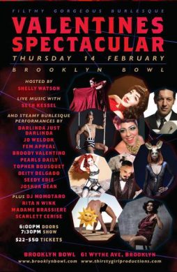 There are a staggering number of events of all stripes happening on Valentine’s Day, as show and party producers rush to appeal to the lovers, the lonely, and everyone in between. Some happenings are best enjoyed in a coupled sense, but others are fun for anyone. I wouldn’t say something called the Filthy Gorgeous Burlesque Valentine’s Spectacular is necessarily fun for the whole family, due to the large quantities of well, titties, but it’s an evening that can certainly be a good time for anyone regardless of relationship status. “Singing siren” Shelly Watson will welcome a stacked lineup that includes Jo “Boobs” Weldon, Darling Just Darlinda, and this year’s Miss Coney Island Pearls Daily, plus live rockabilly music.