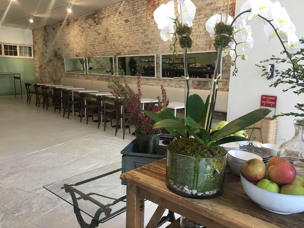 The restaurant serves Sage Kitchen catering favorites, albeit in individual servings. The chicken schnitzel and apricot-fig jam sandwich is available alongside fresh-out-of-the-oven salted tahini chocolate chip cookies.
