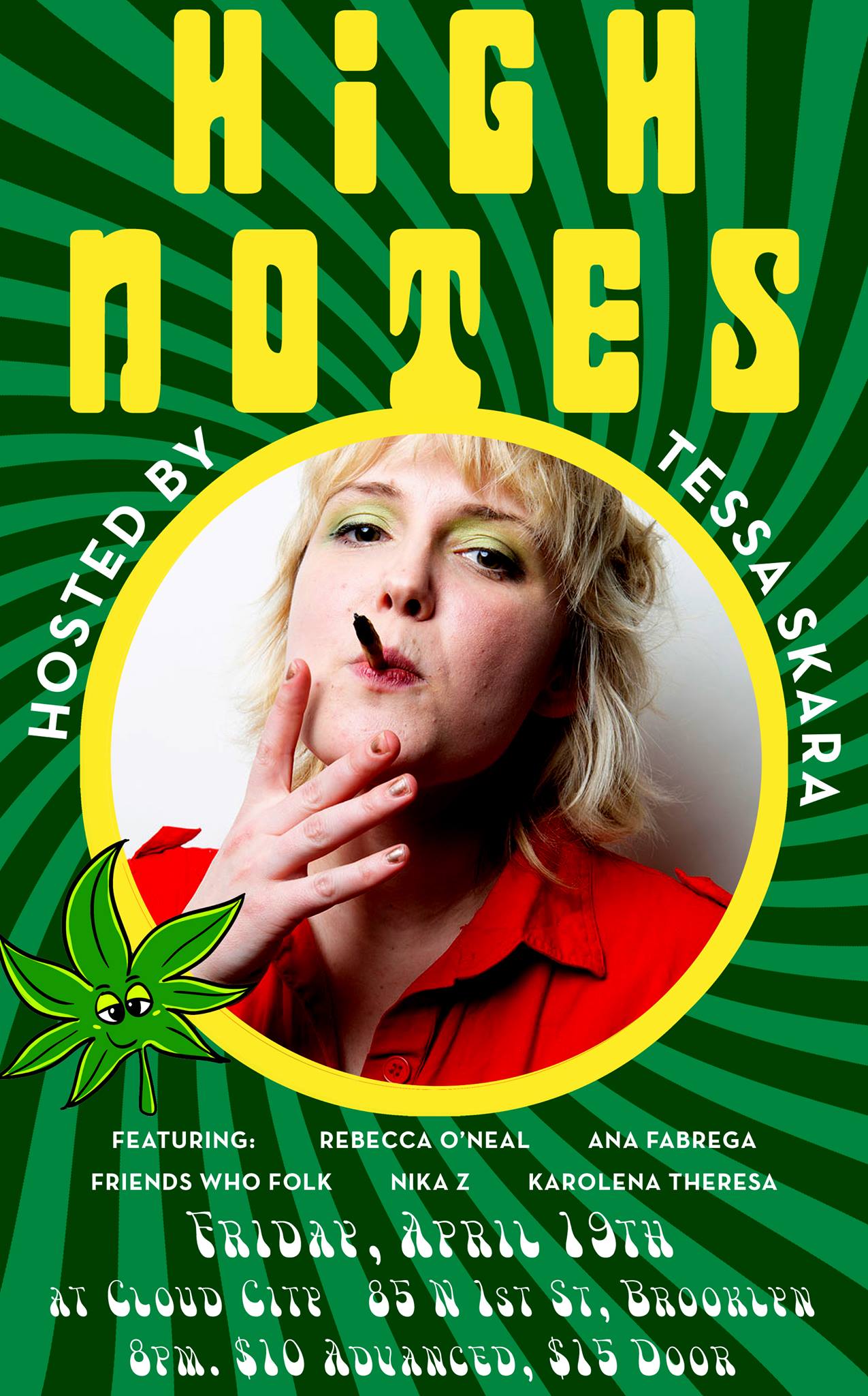 Saturday is 4/20, which you might already know if you have a calendar and/or brain. There are countless activities to do on such a day, one of which includes get too high to leave the house. If you’re someone inclined towards that last one, it may be wise to celebrate 4/20 a day early, just in case. And lo, you can do that exact thing at the latest edition of Tessa Skara’s monthly High Notes variety show, falling handily on 4/19. As per usual, you can expect a night of queer, high comedy and music, this time from Rebecca O’Neal, Ana Fabrega, Friends Who Folk, Nika Z, and Karolena Theresa.