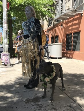 It was now close to 2pm, and the parade had a dozen more stops until the closing ceremony at the East River. I said goodbye to George and a few other new friends and walked a block in the wrong direction before turning west on 9th Street, where I ran into the three young women who’d done the trash dance. From rolling around in the soil, their faces were covered in dirt. Tear marks traced their face. “We got so much dirt in our eyes,” said dancer Miu Soda, who had a plastic fork, a bottle cap, and green tinsel pinned to her chest. “My eyes were watering the whole time.”