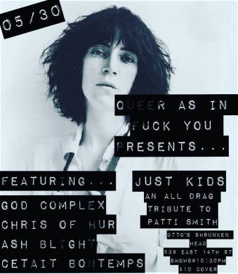 Though technically Pride month doesn’t kick off till June, there’s no reason you shouldn’t enjoy some good old fashioned queer performance before then (and, of course, during Pride month too). Tonight, it’s the return of Vylette Tendency’s punk drag showcase Queer as in Fuck You, taking up residence at East Village bar for tiki weirdos, Otto’s Shrunken Head. This time, they’re paying tribute to the OG punk poet, Patti Smith. Grab a drink, park yourself in the back room, and have a queer old time watching performances by C’était BonTemps, Ash Blight, Chris of Hur, and winner of this year’s Brooklyn Nightlife Award for Drag King of the Year, God Complex.
