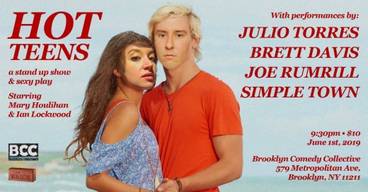 What is there to say about teens? They use TikTok, or so I’ve been told. They Juul, maybe, even though they’re not supposed to. And some teens, particularly the ones inhabited by comedians Mary Houlihan and Ian Lockwood, fancy themselves hot as well. Not only are they hot, but they live lives full of glamour and drama, and simply must share all of it with you in the form of a comedy show. As summer is just on the horizon, Mary and Ian will be dishing about their vacation plans, and have invited guests Julio Torres, Brett Davis, Joe Rumrill, and sketch group Simple Town to help them along the way.
