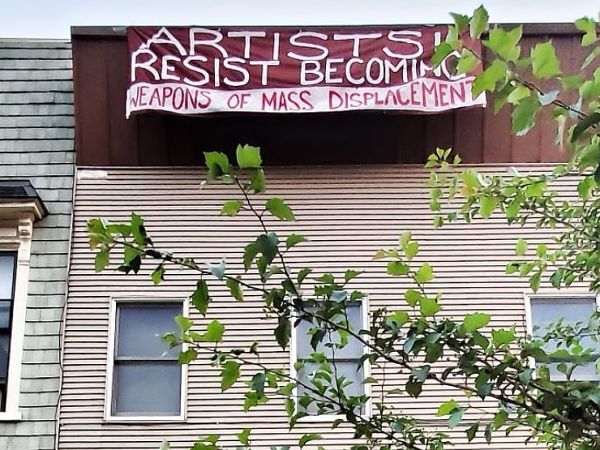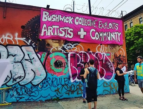 Bushwick Collective held its annual block party this month in Bushwick, pairing blocks of street art with food trucks and performances by artists like rapper/pear enthusiast Rick Ross. However, cell phones and pot smoke weren’t the only things in the air. Beside the Jefferson Street L train station, the closest station to the block party, activists hung a bright pink banner reading “Bushwick Collective Exploits Artists + Community.” Activists also stood on a rooftop behind the stage, flying a stark burgundy banner reading “Artists Resist Becoming Weapons of Mass Displacement.”