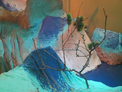 Her favorite part of the exhibit is the “Mountains,” where a thick green haze leads into tree-ridden, sculpted green mountains. “While making the Mountains, I did Chinese painting on the wall– and I haven’t painted for many years!” she says. “So when I do, I feel like I get myself back.”