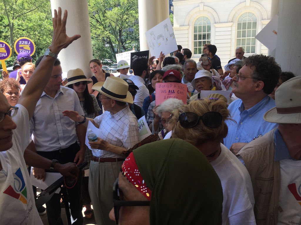 Earlier that day, Chin met at the steps of City Hall with supporters of the development, who clustered in a circle trying to escape the sun’s rays and heat. “Housing is a right. Fight fight fight!” they shouted moments before walking into the building.