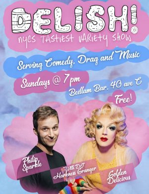 It’s always nice to enjoy something tasty on a Sunday, otherwise known as a day of dread, where people in school have to do homework and people with jobs have to face the notion of yet another week of work. Of course, food is always a good option, but deliciousness can come in many forms. One of which is Delish, comedian Philip Sparkle and drag performer Golden Delicious’s weekly queer performance extravaganza at Bedlam, which also happens to be free—yum! This week features Drew Lasch, Gaby Hornig, Andrew Coalson, Bobby Hankinson, and Gloria Swanson, with tunes as per usual by DJ Harkness Granger.