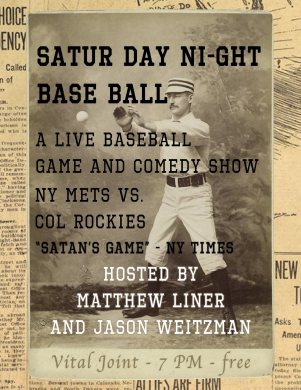 I cannot say I am much of a sports fan, or really have ever paid attention during an in-person or televised sports game in my life. When I watched the Super Bowl, I would be eating snacks and look up to see what had happened to make everyone yell and holler, only to realize I still don’t know how football works. And yet, I am somehow intrigued by Satur Day Ni Ght Base Ball, the latest offering by comedians Jason Weitzman and Matthew Liner. First of all, the title contains so many spaces where there normally aren’t any. Secondly, the description of the show definitely makes it seem like baseball is a sex thing (and who can say? For some, it can be, anything can) and includes the very good phrase “beckoning hole.” And if all that hasn’t piqued your interest, know that this show is free, it will be happening as the Mets play the Colorado Rockies, and it will have something to do with baseball and sports commentary. Maybe there will be snacks?