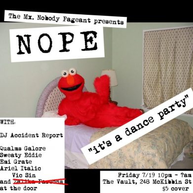 Descend into the dark depths of basement venue The Vault in Brooklyn (formerly known as Tilt) tonight, and you’ll find a night of merriment presented by The Nobodies, a drag collective that often dabbles in inclusive pageantry and also, wrestling. Tonight, they’re throwing a show and party with drag and burlesque acts by Emi Grate, Sweaty Eddie, Qualms Galore, plus host Ariel Italic and tunes from DJ Accident Report. Expect acts that are weird and attention-grabbing, and if the heat is making you want to stay in and veg out, know that this starts at 11 pm, a time when the cursed sun will definitely not be out.