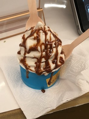 Currently, there’s only one soft serve flavor available, the aforementioned more traditional “vanilla sweet créme” that is served in a cup or cone and then adorned with various toppings, such as pretzels, salted pecans, sprinkles, and a variety of syrups, from coffee to mint chocolate. Lu says they’re planning on introducing a rotating second flavor in the coming months.