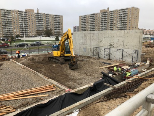 In recent weeks, however, the walls have been built back, and today— before Mother Nature once again asserted herself by dumping rain on workers— rebar was being laid down so that the court’s concrete slab could be poured. The Parks Department’s project tracker indicates the $3.7 million reconstruction is 61 percent done, and should be complete by March of 2020, a year after construction commenced. The project is years in the making, as design began in November of 2015. The area between Beach 105th and 102nd will also get two ping pong tables, sitting areas, and a fitness area, according to plans. And a couple of the chess tables that used to dot the area— also uprooted by Sandy— have already sprung back up.
