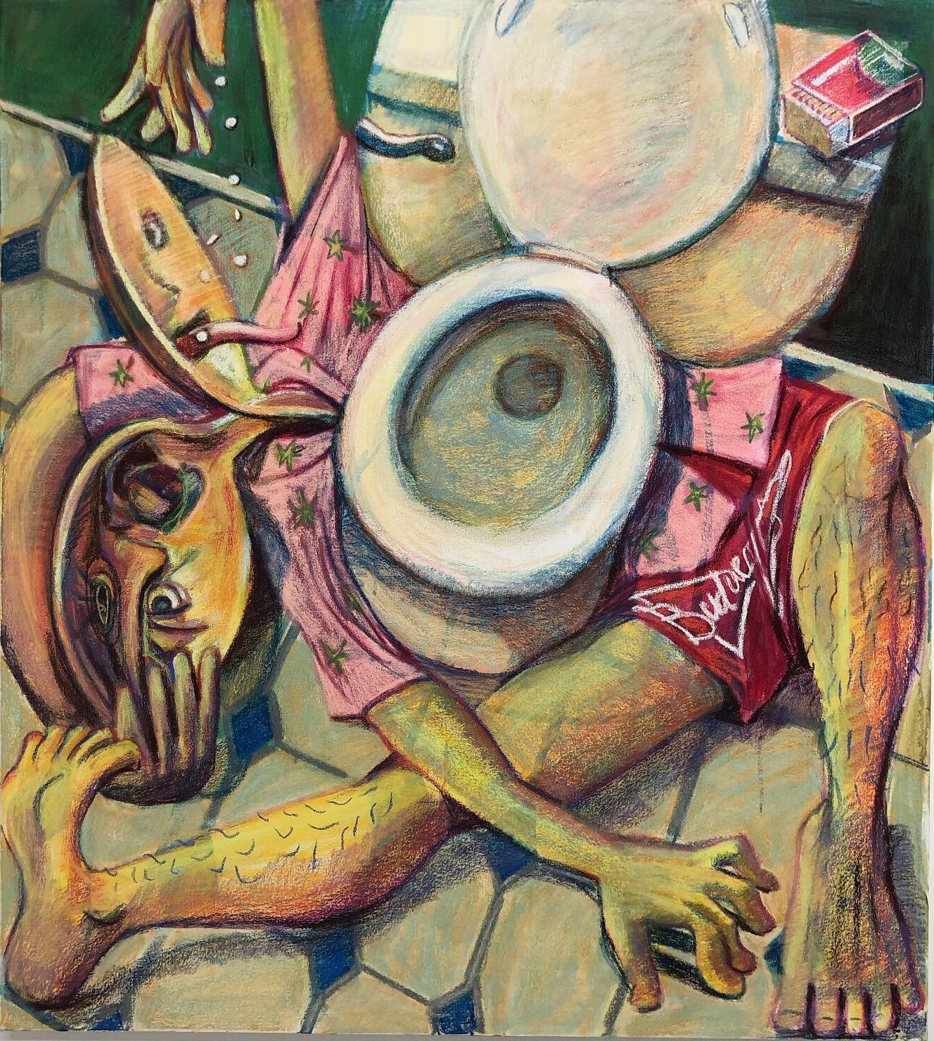 There’s quite a lot of work out there about partying, and even when you narrow it down to work about going out in Brooklyn, the canon still seems quite vast. However, there are still ways of making the medium seem fresh. One work by Anya Rosen, which will be included in a duo show at Bushwick’s Castellain Gallery starting Friday, depicts a man in Budweiser shorts and a pink Hawaiian shirt on the floor contorted around a toilet. Upon closer inspection, the man is not a man at all but two spoons with faces, recalling the famous comedy and tragedy drama masks, but with more drug references. It’s a grotesque yet dreamily childlike depiction of those times you know you’re going too hard, but you’re not quite done yet. In this show, Rosen’s works and those of fellow artist Jordan Segal shine a light on not just going out, but the less-than-perfect ways humans can behave, and do so in a way that feels playful and understanding.