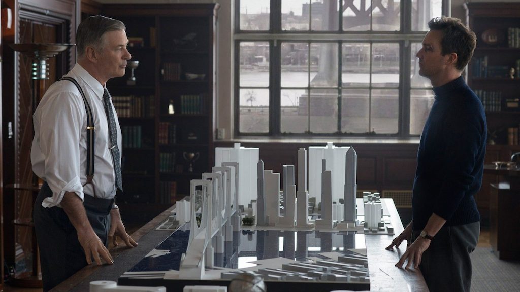 At a press conference ahead of Motherless Brooklyn‘s local premiere at the New York Film Festival, Willem Dafoe, who plays an engineer caught up in Moses Randolph’s power machinations, said the Moses character is a “composite.” His palatial office is littered with sketches that, at a glance, are identical to the plans for Robert Moses’s never-completed Lower Manhattan Roadway. But then, at a gala, he tells the crowd that it’s the doers, not the hand-wringing intellectuals, that “make this country great.” Clearly there’s also some Trump in this crooked, power-crazed, megalomaniacal demagogue.