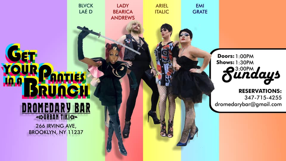 Sometimes you’re tired, and you don’t want to wait until 8 pm or 10 pm (or god forbid, midnight) to see a show. And sometimes, you have a particular craving for brunch. Well, you’re in luck, because at Bushwick “urban tiki” bar and restaurant Dromedary, you can get an early show and a hearty brunch all under one roof, thanks to Get Your Panties in a Brunch. Indeed, every Sunday you can catch drag performers Emi Grate, Lady Bearica Andrews, and other special guests lip syncing for their life while you cut into the poached eggs atop your Benedict, which can sometimes feel like a performance in itself.