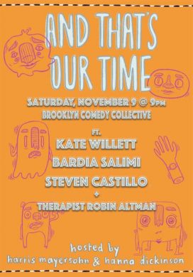 Those of you who have been to Brooklyn Comedy Collective shows before (or at least were planning to) may know that they were housed within The Brick in Williamsburg. Now, that’s no longer the case, but fret not, the Collective still lives on in all their weird glory. They recently moved to the nearby Cantina Royale, including And That’s Our Time, a particularly unique show hosted by Harris Mayersohn and Hanna Dickinson. Sure, there’s stand-up, like any other comedy show, but there’s a twist: an actual licensed therapist watches everyone’s sets, and then offers critique and analysis. Perhaps it’ll be a learning opportunity for both performers and audience. If anything, it’s cheaper than most actual therapy sessions.