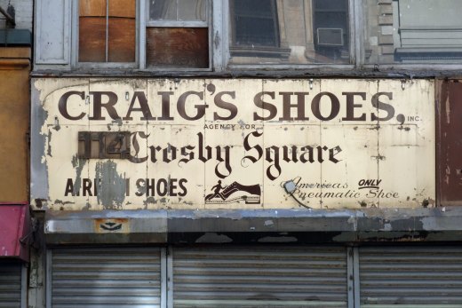 Craig’s Shoes in Tribeca opened in 1949. Before it closed in 2006, the New York Times noted some of its famous customers. “Senator Charles E. Schumer has picked up Rockport Dressports for $100. And the actor Robert De Niro once sent an autographed picture after an assistant bought shoes for him there.” Renovations in 2019 revealed Craig’s ghost sign.