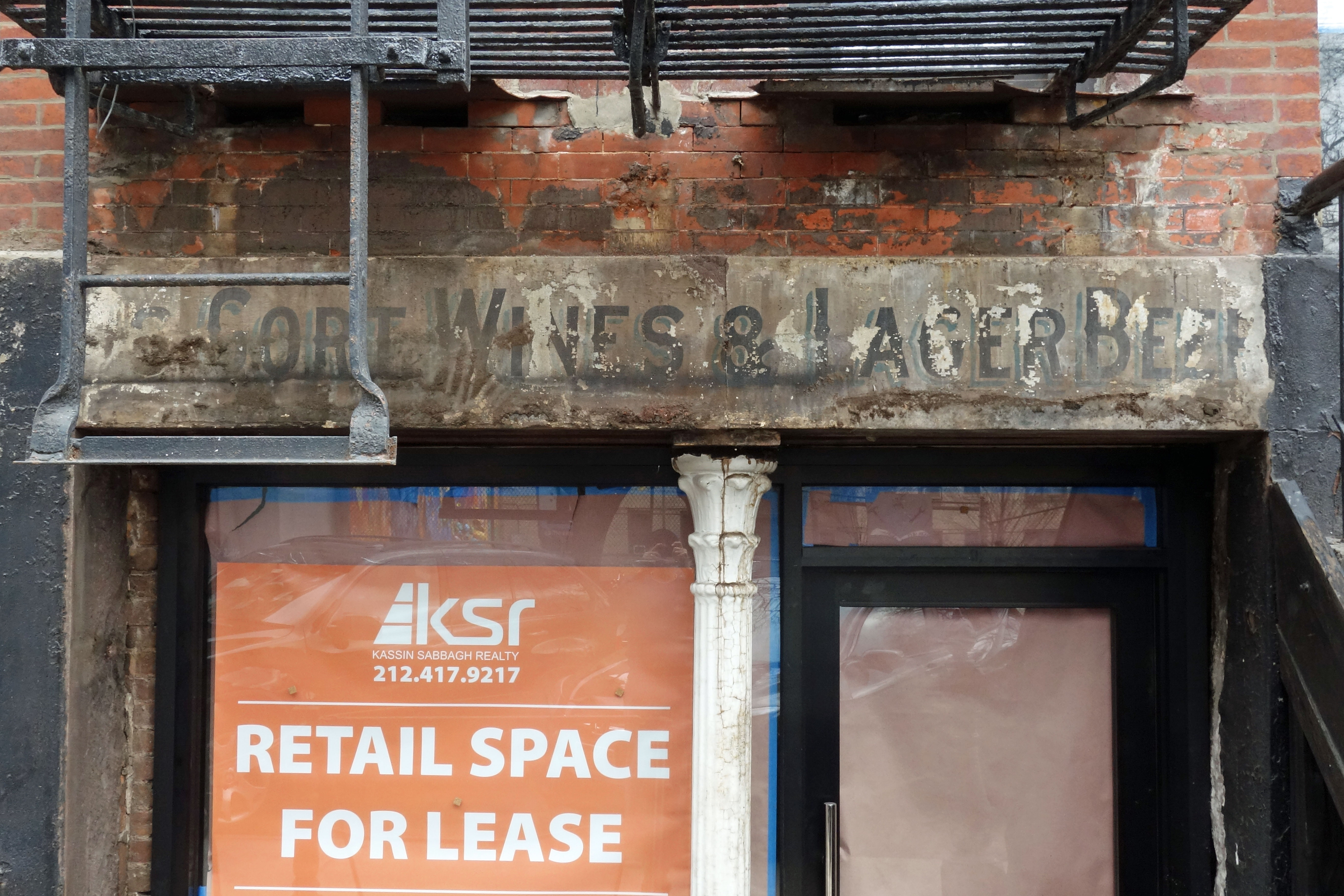 The retail space down a few steps in the East Village was a bar and grill from at least the 1940s until the 1980s. S. Cort Wines & Lager Beer is apparently a much older tenant, though little is remembered about it. Its ghost sign was revealed during renovations in 2019.