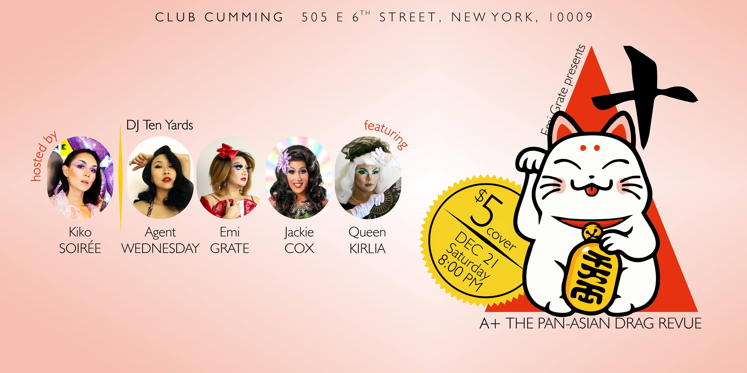 As we’ve previously noted, Asian drag performers are having a bit of a moment these days. However, it still isn’t entirely commonplace to see many of them in the same lineups, particularly in the sometimes-less-inclusive isle of Manhattan. That changes on Saturday, thanks to the latest edition of Emi Grate’s “pan-Asian drag revue” A+. This week’s show celebrates not only Asian culture but family (both chosen and not—but mostly chosen) through shows, shows, shows by Agent Wednesday, Emi Grate, Jackie Cox, Queen Kirlia, and host Kiko Soirée.
