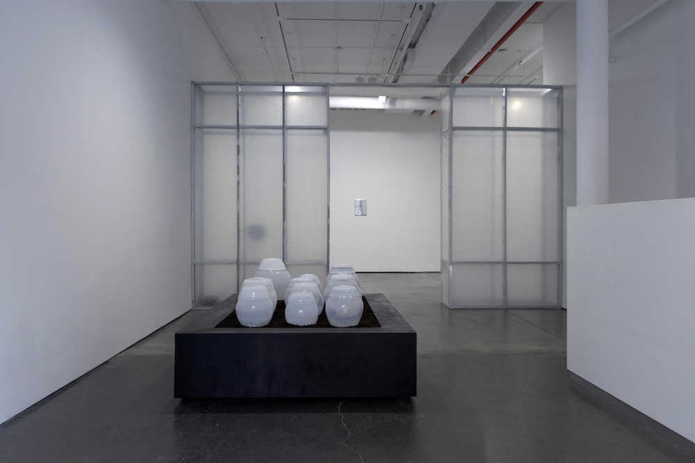 This “lab” exhibition by artists Tiffany Jaeyeon Shin and Jesse Chun is an intellectual and sensorial treat, offering much to see, hear, ponder, and even smell. The show focuses on the curious relationship between language and digestion, with each artist centering their work around one of these two components. Chun unpacks and deconstructs language’s ability to “render one readable as a subject,” from the ubiquitous presence of English to the power of official written documents, while Shin (who also has an ongoing session at Recess) utilizes ancient Korean vases used for fermentation to explore the theoretical and literal vitrification (the process of a substance becoming glasslike) that occurs in conjunction with Westernization.