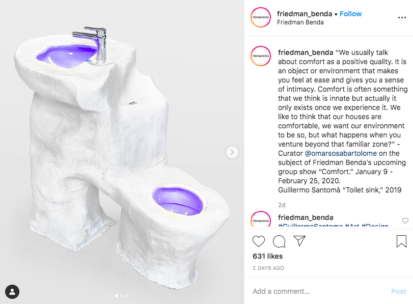 Everyone has a different definition of comfort. Your grandfather’s old and cigarette-scented armchair might feel like home to you but cause another person to wrinkle their nose in disgust. Curator Omar Sosa’s latest show at Friedman Benda focuses on the harmonies and contradictions inherent in items, particularly pieces of furniture and design, meant to bring comfort in one way or another. As this is an art exhibition and not a furniture showroom, comfort is usually interpreted quite creatively—think a boxy bookshelf that leans but never falls, a sculpture entitled “Toilet Sink,” and a colorful blanket meant for a pair.