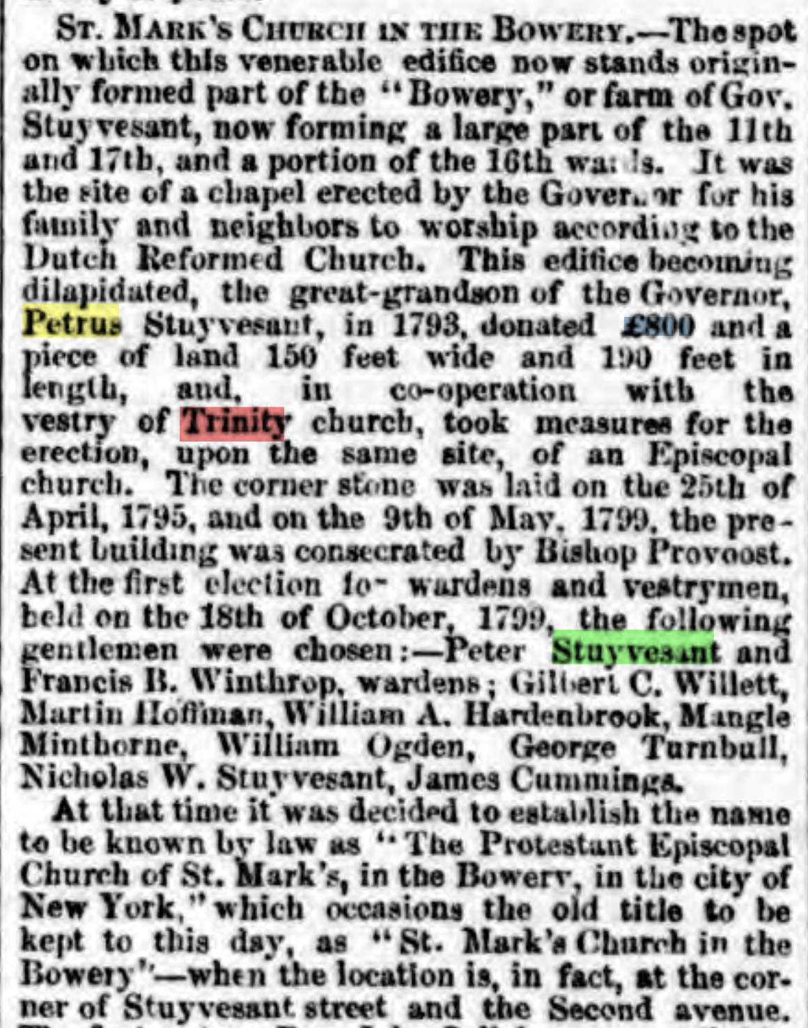 In 1793, Petrus did what any good descendant of greatness would do. Hailing from a family that has at this point converted to Episcopalianism (this was the new “in,” as most of New York’s prominent families were Episcopal by the late 18th century), Petrus donated money to Trinity Church to construct a new church over ol’ Pete’s 10th Street chapel.
