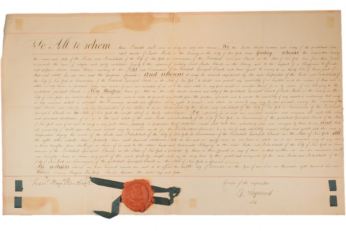 To the Broadway star, the solution was fairly simple: Give St. Mark’s a chunk of the church farm. In return, it would surrender all other claims to the land. Hamilton’s prowess worked and in 1799, St. Mark’s became an independent parish. Not convinced of Hamilton’s genius? See the deed of the exchange below: