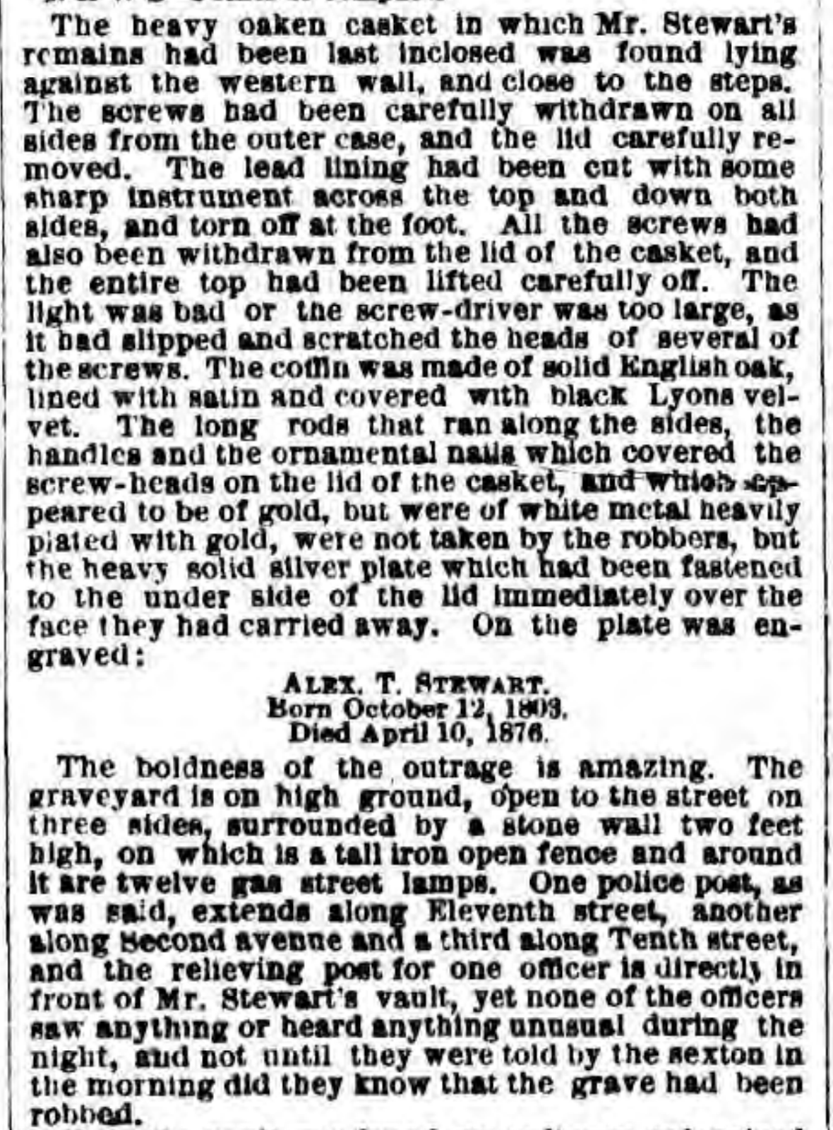 Francis Parker, assistant sexton of St. Mark’s Church, on going to his work In the churchyard at 8 o’clock yesterday morning saw a suspicious mound of fresh earth lying, as he supposed, around the entrance of the northern vault. A closer view enabled him to see that the Stewart family vault had been violated… Suspicious marks found a month before upon the slab which overlies the tomb, and upon surrounding objects, indicated that an attempt upon the vault by body-snatchers was in contemplation.